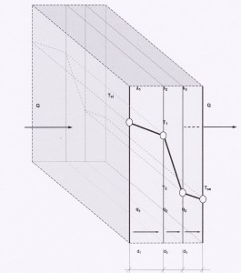 Variatia pe grosime a temperaturii (gradientul de temperatura) la trecerea fluxului termic prin conductie poate fi reprezentata ca in figura de mai jos. Se poate ilustra grafic ca temperatura in orice punct din perete sau tavan, si deci gradul izolarii termice, depinde de grosimea stratului, de conductivitatea termica a stratului, si de diferenta temperaturilor din casa si a celei din exterior! (Cresterea λ sau a diferentei temperaturilor mareste panta variatiei temperaturii in strat; cresterea grosimii stratului micsoreaza aceasta panta.)