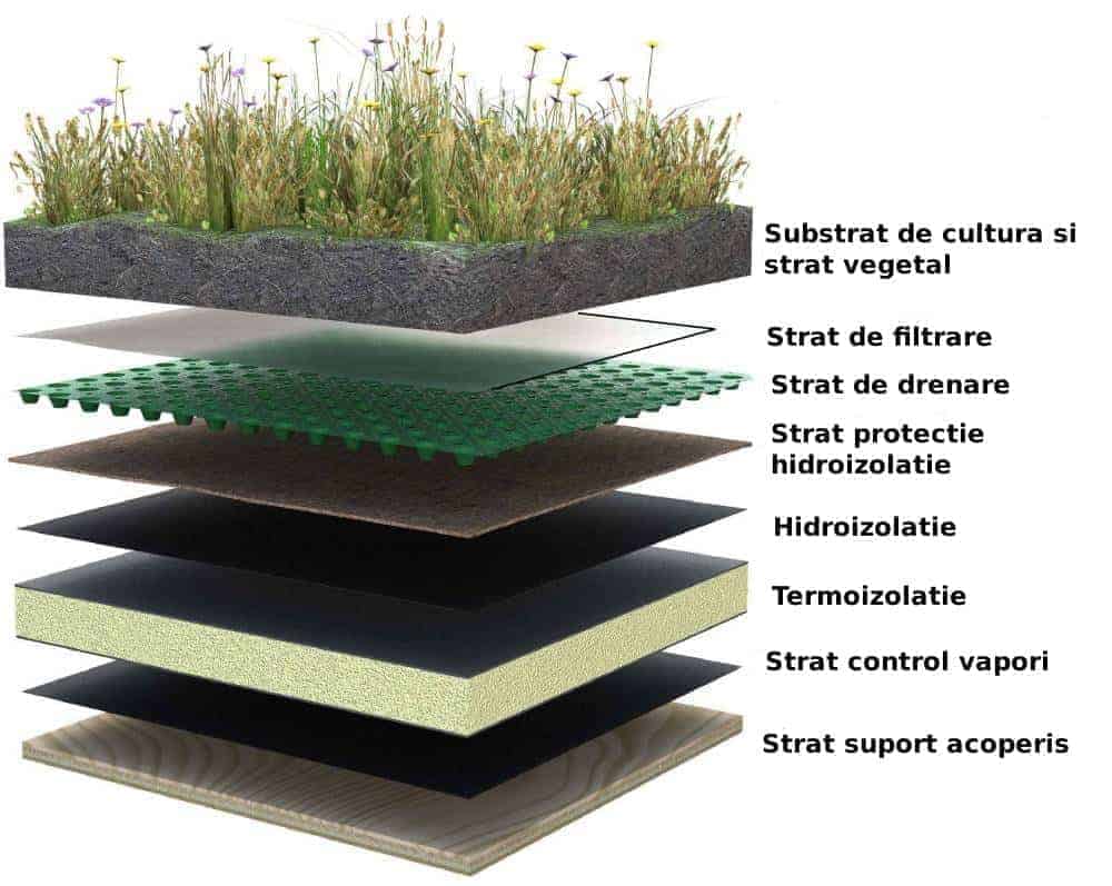 Terasele verzi sunt alcatuite cel putin din straturile aratate in imaginea de mai jos si pot fi extensive sau intensive.